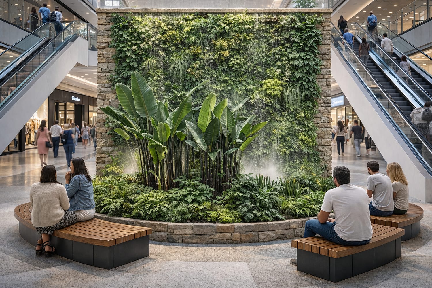 Dans une galerie commerciale par exemple, un mur végétal peut devenir un repère : un point de rendez-vous, un décor photo, une zone de détente. Et ce n’est pas anecdotique : ce type d’aménagement augmente le temps passé sur place et améliore l’image globale du centre.