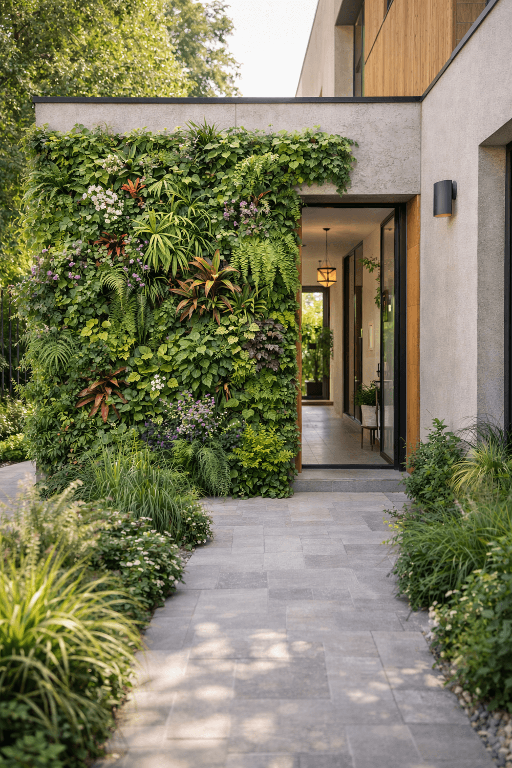 Dans un espace extérieur, l’œil cherche des repères. Un mur végétal devient immédiatement un point focal. Il attire la lumière, donne du relief et impose une identité. C’est ce qui explique son succès dans les environnements où l’image compte : entrée de maison contemporaine, terrasse design, hall d’immeuble, établissement recevant du public, showroom ou galerie commerciale.
